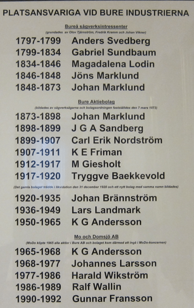 Under denna tid var Johan Brännström disponent 1920-41 och ansvarig chef 1920-36, Lars Landmark skogschef 1920-49 och verkställande direktör 1936-49, medan Martin Söderlind var disponent 1945-49 och Simon Carlsson överingenjör och chef för trädsliperiet 1958-69. Läs vidare om Bure AB:s historia